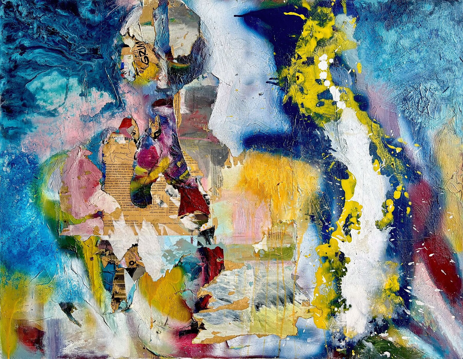 On the left, a strongly material figure emerges from Paolo Amoretti’s intervention: a body constructed through collage fragments of newspaper and painted layers, bearing visible traces of time, memory, and stratification. The surface feels grounded, tactile, and archaeological, as if identity were something assembled from remnants and lived experience.