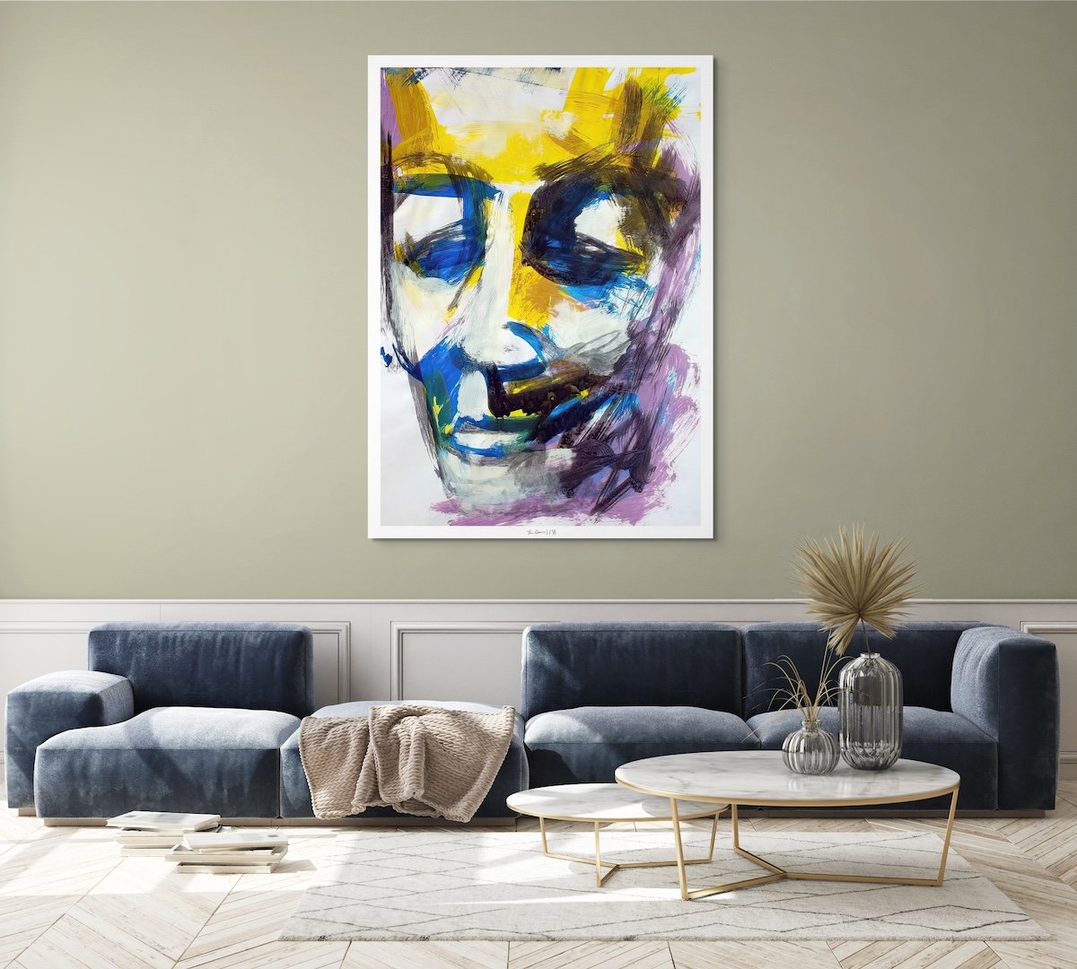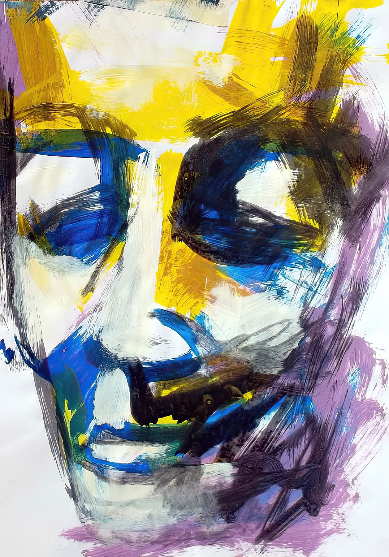 Archetypal Vision è un ritratto imponente in cui convergono astrazione ed energia primordiale. Audaci pennellate di giallo, blu, viola e nero si fondono in un volto che sembra antico e futuristico al tempo stesso: una visione che emerge dall’inconscio collettivo.