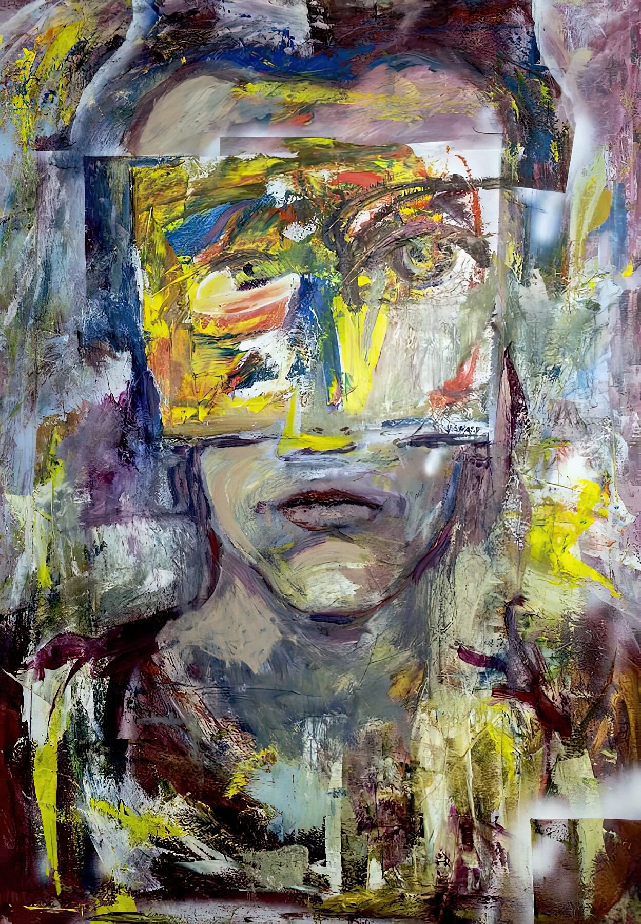 The face emerges through overlapping planes of color and texture, partially obscured and reassembled as if seen through shifting states of perception. Rather than offering a fixed likeness, the portrait unfolds as a psychological landscape, where presence is built through accumulation, interruption, and depth.