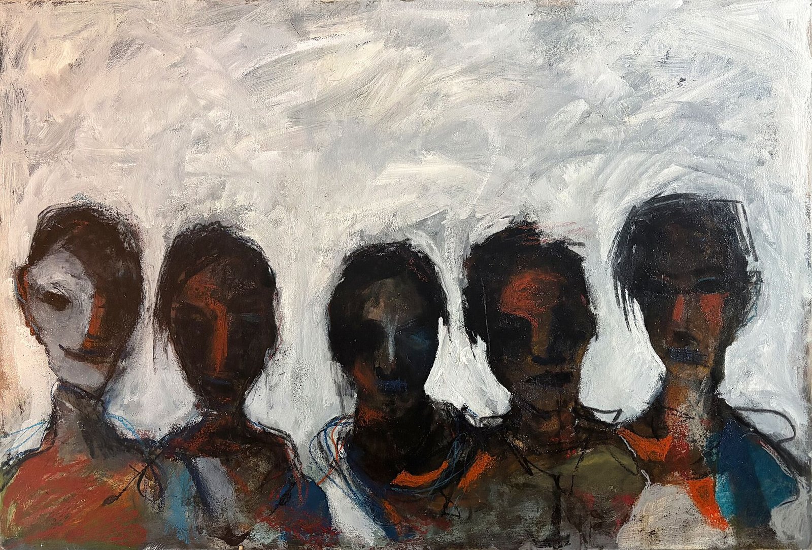 Five figures emerge from a pale, textured field, their faces partially obscured, darkened, or dissolved into matter. Rather than individual portraits, they appear as archetypal presences — witnesses rather than actors — bound together by silence and proximity. Their anonymity intensifies their emotional charge, inviting the viewer to sense what is held rather than what is spoken.