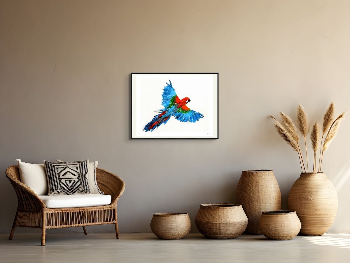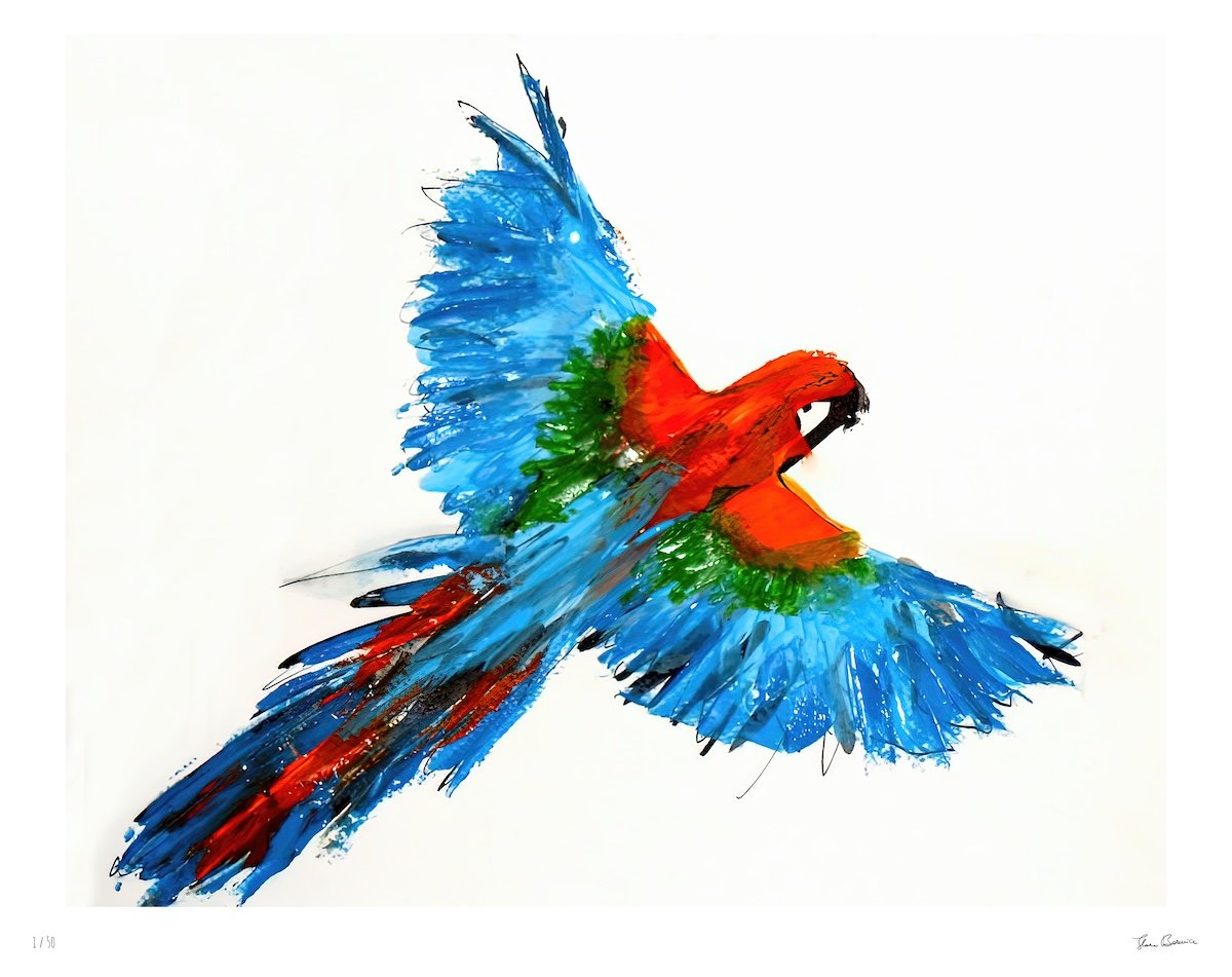 Sky Dancer celebrates the freedom of flight and the poetry of movement. With vibrant strokes of crimson, emerald, and luminous blue, the parrot takes center stage in a dance of color and light. This work radiates vitality, reminding us of the joy and power in embracing our true nature.