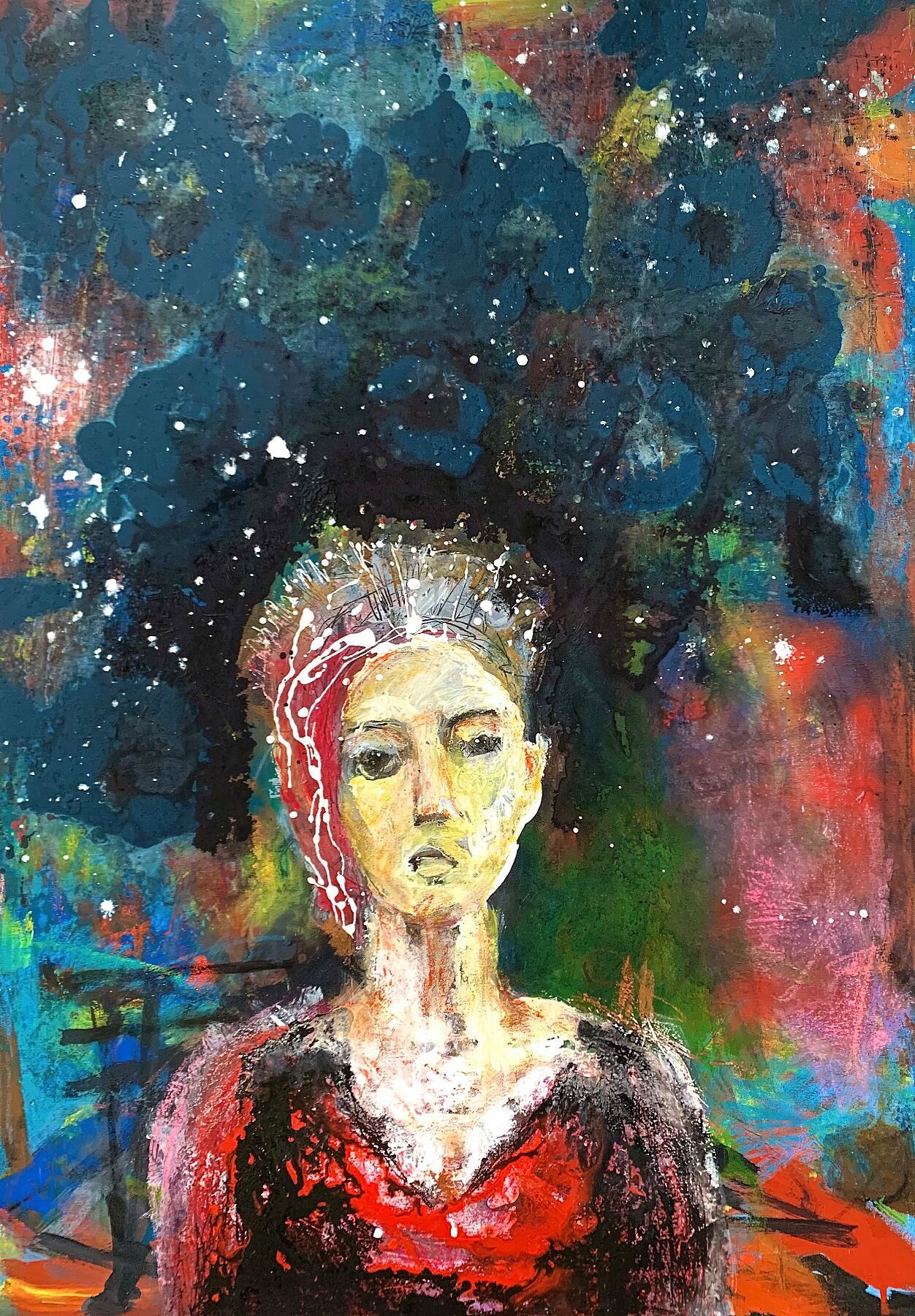What emerges is a luminous figure suspended between inner and cosmic space. The face appears illuminated from within, surrounded by a deep, nocturnal field scattered with marks that evoke stars, memory, and the vastness of inner experience. Color and texture accumulate in layers, suggesting both fragility and strength — a presence shaped through renewal rather than erasure.